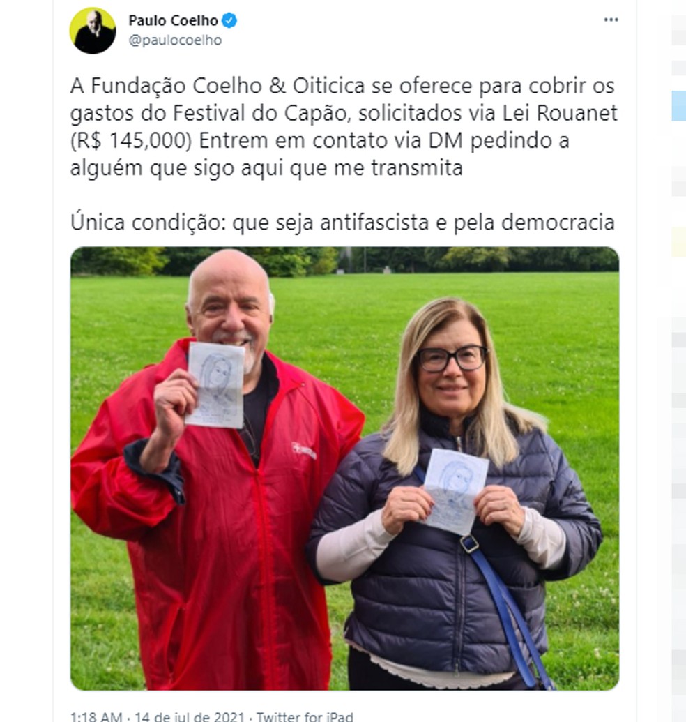 Segundo o G1, a postagem foi feita na madrugada desta quarta-feira (14). Com uma foto ao lado da esposa, Christina Oiticica, com quem tem uma fundação, Paulo escreveu: "A Fundação Coelho & Oiticica se oferece para cobrir os gastos do Festival do Capão, solicitados via Lei Rouanet (R$ 145,000). Entrem em contato via DM [mensagem direta, em tradução livre] pedindo a alguém que sigo aqui que me transmita. Única condição: que seja antifascista e pela democracia."