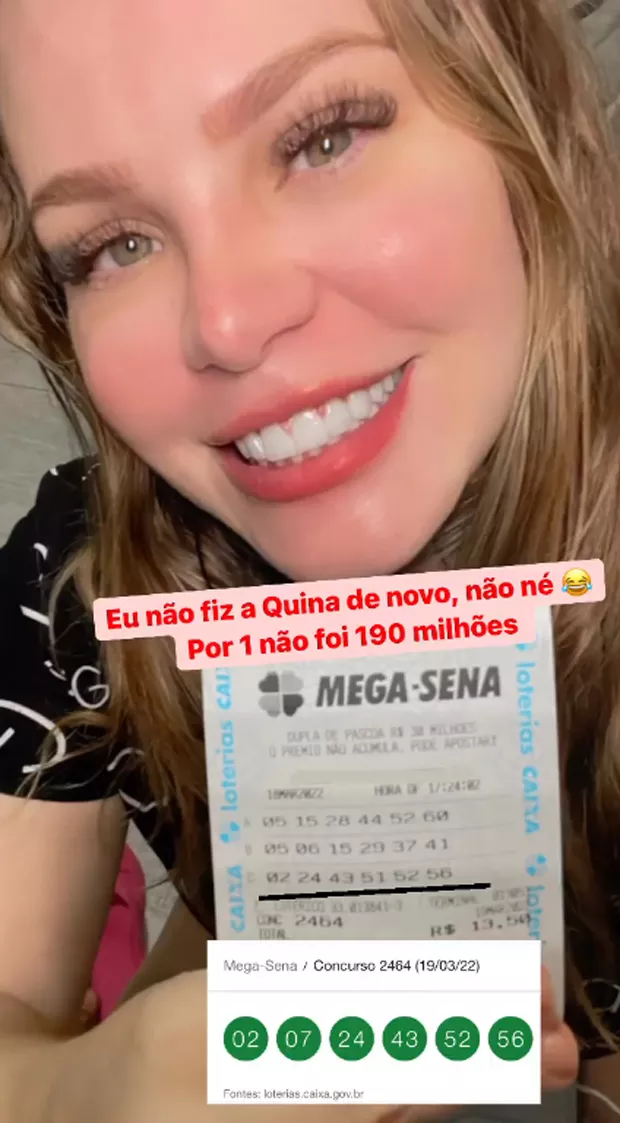 "Eu não fiz a Quina de novo não, né? Por um não foi cento e noventa milhões", vibrou ela nos stories do Instagram. Com a quina, Paulinha vai embolsar R$ 35.454,28.