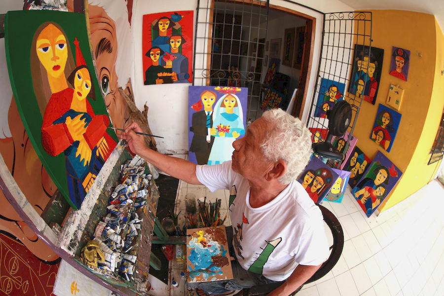 Aos 72 anos, o artista plástico Nonato Oliveira, nascido em São Miguel do Tapuio, estado do Piauí. Seu estilo é caracterizado como uma mistura de primitivo com expressionista. As cores vivas e fortes são usadas para expressar temas como a seca, a fome, a cultura popular, a religião e o folclore. Inaugurou no Piauí uma espécie de regionalismo sofisticado, tendo sido um dos pioneiros nesta abordagem das artes plásticas no Nordeste. Com uma pintura ímpar, de estilo peculiar claramente reconhecido, já participou de mais de 80 exposições, no Brasil, Estados Unidos e na Europa.Arte: Folclore Brasileiro. Localizada na Plaza de Chueca.