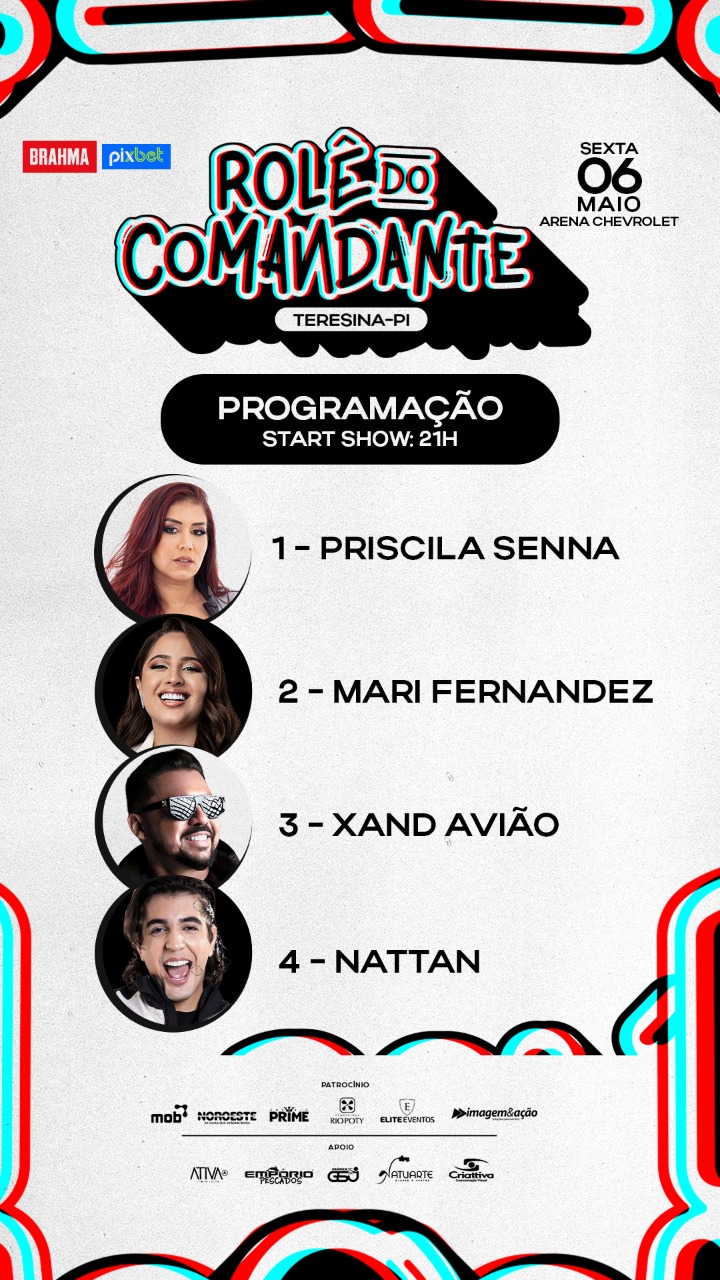 Brahma e PixBet apresentam o show Rolê do Comandante. O evento tem patrocínio da Mob Telecom, Lojas Noroeste, Empório Prime, Shopping Rio Poty, Elite Eventos e Imagem e Ação. O apoio é assinado pela Ativa Comunicação, Empório Pescados, Gráfica GSJ, Natuarte e Criativa Comunicação Visual.