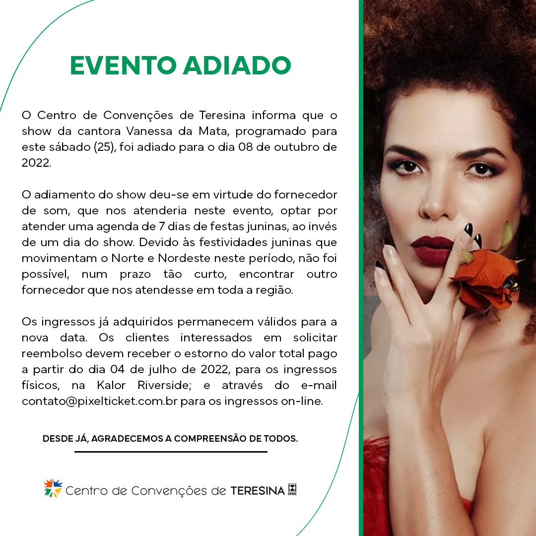 O Centro de Convenções de Teresina informa que o show da cantora Vanessa da Mata programado para este sábado (25) foi adiado para o dia 08 de outubro de 2022.