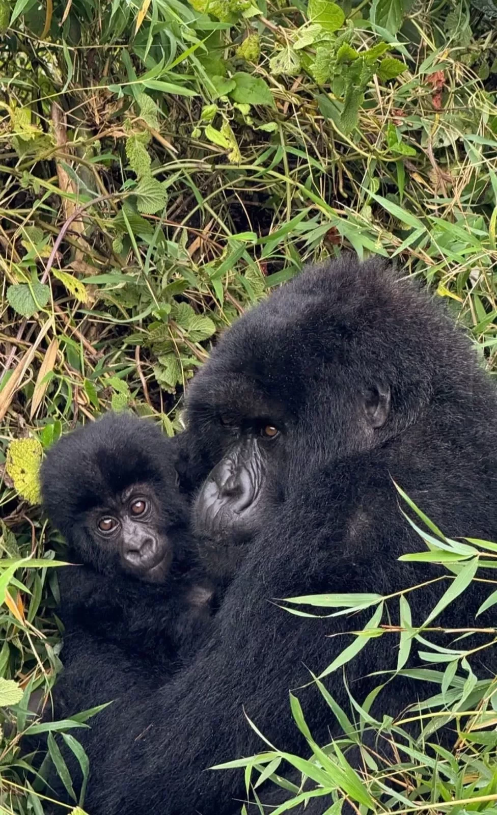 “A trilha demorou duas horas até achar os gorilas e duas horas para voltar”, escreveu Duda. “Somos acompanhados por um segurança armado para proteger de qualquer imprevisto na selva”, destacou.