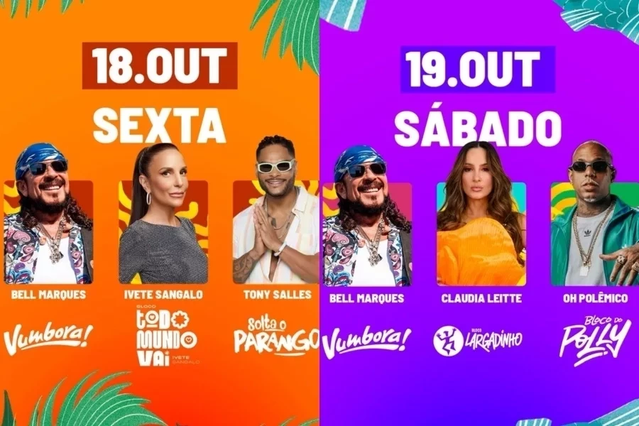 Entre as atrações da avenida estão Bell Marques, Ivete Sangalo, Tony Salles, Claudia Leitte e Oh Polêmico. No Camarote Esportes da Sorte, onde acontece o after da folia, a festa fica no comando de Natanzinho Lima, Léo Santana, Eric Land, Maiara e Maraisa, Felipe Amorim e Alinne Rosa.