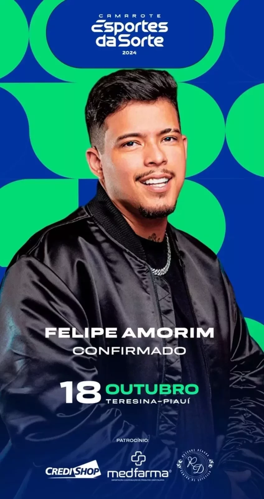Felipe Amorim é mais um artista confirmado no Camarote Esporte da Sorte na Micarina 2024, o evento acontece em Teresina entre os dias 18 e 19 de outubro. O cantor se apresenta no dia 18 e se junta à dupla Maiara e Maraisa, que foram anunciadas como atração no camarote dia 19.
