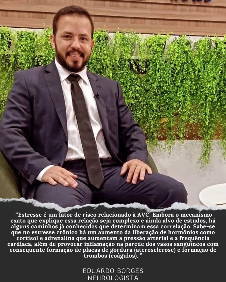 Ainda nesse ponto, o médico Eduardo Borges indica que o estresse crônico aumenta a liberação de hormônios que podem influenciar na pressão arterial e na frequência cardíaca.