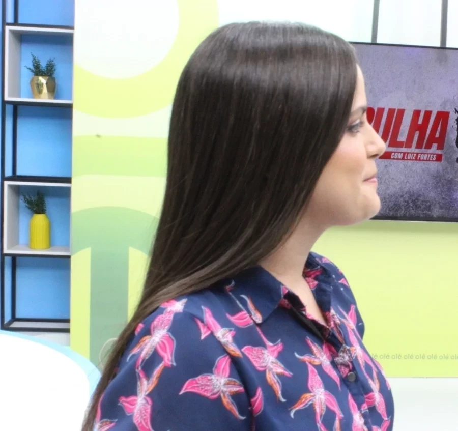 Os pontos da cirurgia ainda são visíveis, mas desaparecem sob os longos cabelos de Geovana Tomé. A apresentadora de 22 anos brinca: “A cabeça permanece aberta”.