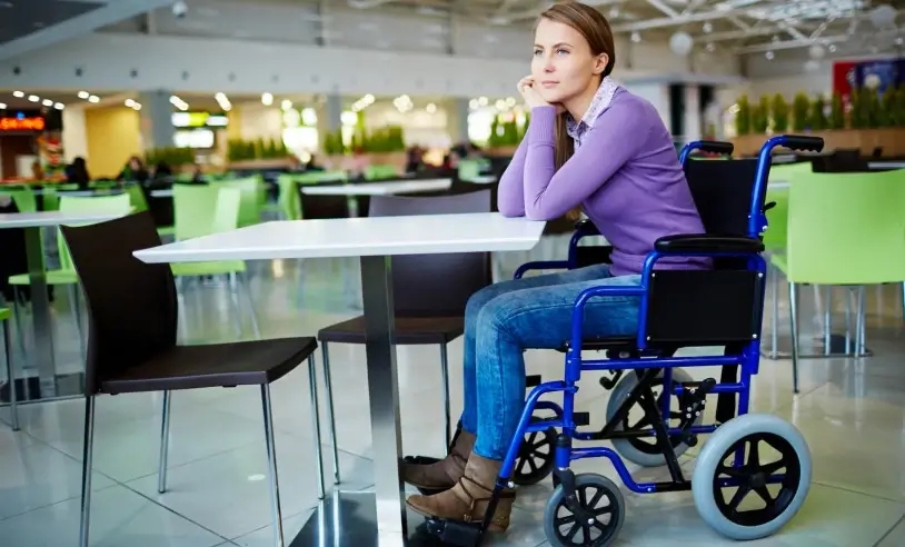 #PARATODOSVEREM NA IMAGEM, UMA MULHER BRANCA ESTÁ EM UMA CADEIRA DE RODAS COM O COTOVELO APOIADO EM UMA MESA DE MADEIRA, ELA ESTÁ COM UM SEMBLANTE REFLEXIVO E APOIA UMA DAS MÃOS NO QUEIXO. ELA TEM O CABELO CASTENHO ESCURO, USA UMA CALÇA JEANS AZUL E UMA CAMISA LILÁS. FIM DA DESCRIÇÃO.