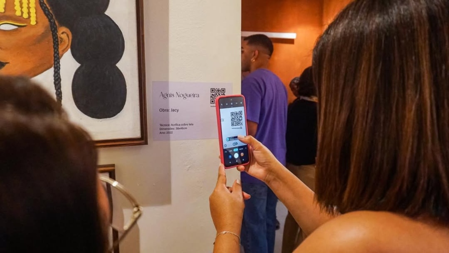 #PARATODOSVEREM Na imagem, uma mulher parda com os cabelos lisos e pretos aponta o celular com a câmera ligada para um qrcode ao lado da obra Jacy, de Agnis Nogueira. FIM DA DESCRIÇÃO.