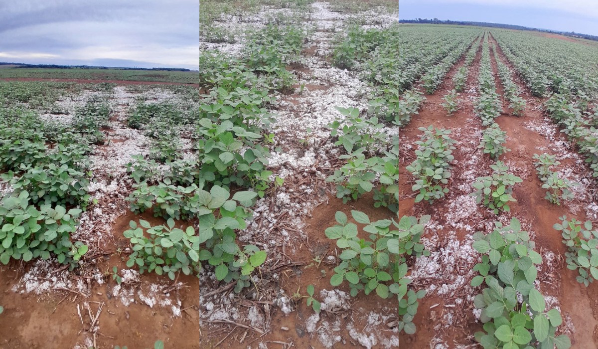 #PARATODOSVEREM A imagem é composta por três fotografias colocadas lado a lado, formando um conjunto que mostra diferentes ângulos de uma plantação em fase inicial de crescimento. Em todas as partes, o terreno aparece avermelhado e coberto por pequenas plantas de folhas verdes, distribuídas em linhas organizadas. Entre as fileiras, espalham-se manchas extensas de um material branco, semelhante a resíduos ou acúmulos de fibras, que se destacam sobre o solo escuro. Esse material aparece de maneira irregular, acompanhando o espaçamento entre as plantas e criando faixas claras que contrastam fortemente com o verde da vegetação. No fundo das três imagens, há uma paisagem rural ampla, com campos contínuos e uma linha de árvores distantes que marca o horizonte. O céu está encoberto por nuvens claras, sugerindo um dia nublado. O conjunto transmite a impressão de acompanhamento agrícola, destacando o estado da lavoura e a presença marcante do material branco sobre o solo. FIM DA DESCRIÇÃO.