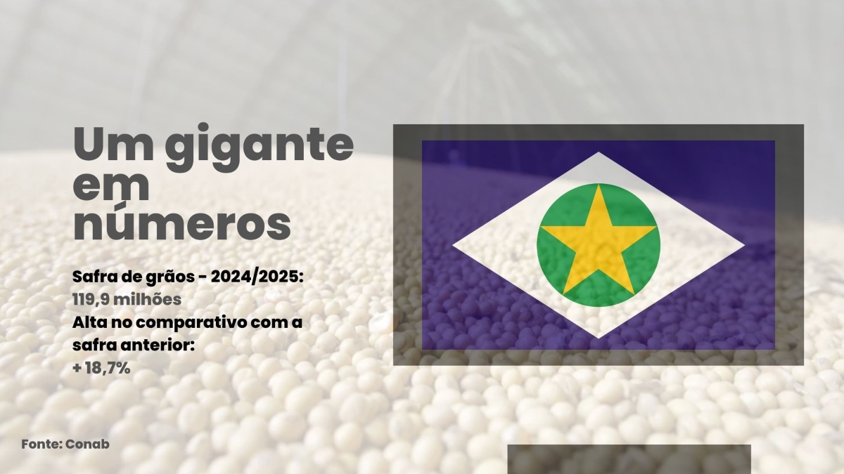 Dados da Conab projetam uma produção de 119,9 milhões de toneladas de grãos na safra 2024/2025 no Mato Grosso, alta de 18,7% em relação à anterior.