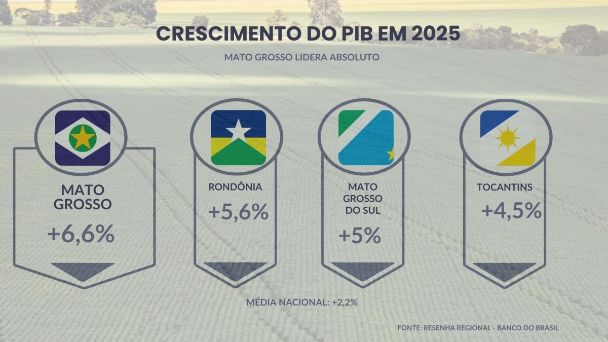 MT tem um crescimento estimado três vezes maior do que a média nacional (Infográfico: MeioNews/Francy Teixeira)O gigantismo dessa terra se traduz em números. É o Estado que mais cresce no Brasil e assim deve continuar, segundo a Resenha Regional do Banco do Brasil, que revisou a previsão de evolução do Produto Interno Bruto (PIB) do Mato Grosso — a soma das riquezas produzidas — para 6,6% em 2025, índice três vezes maior que a média nacional projetada, de 2,2%.