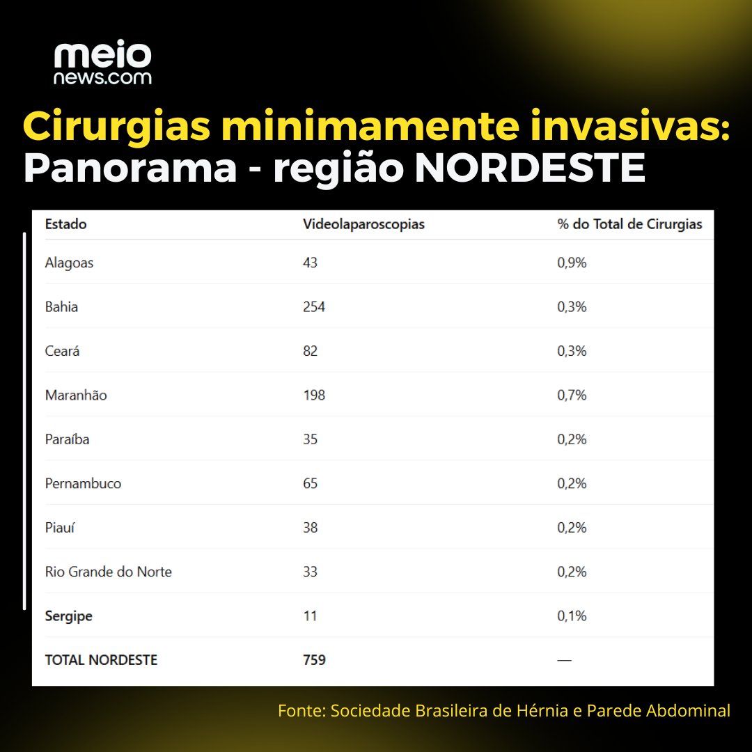 NORDESTE - Em âmbito geral, a região também enfrenta grandes obstáculos na ampliação das técnicas menos invasivas, nenhum ente supera a marca de 1%; o cenário é ainda mais desafiador em Sergipe, que anotou somente 11 cirurgias videolaparascópicas em dois anos.