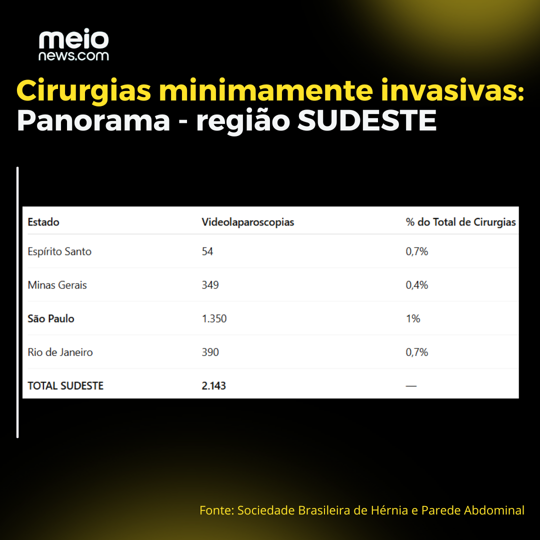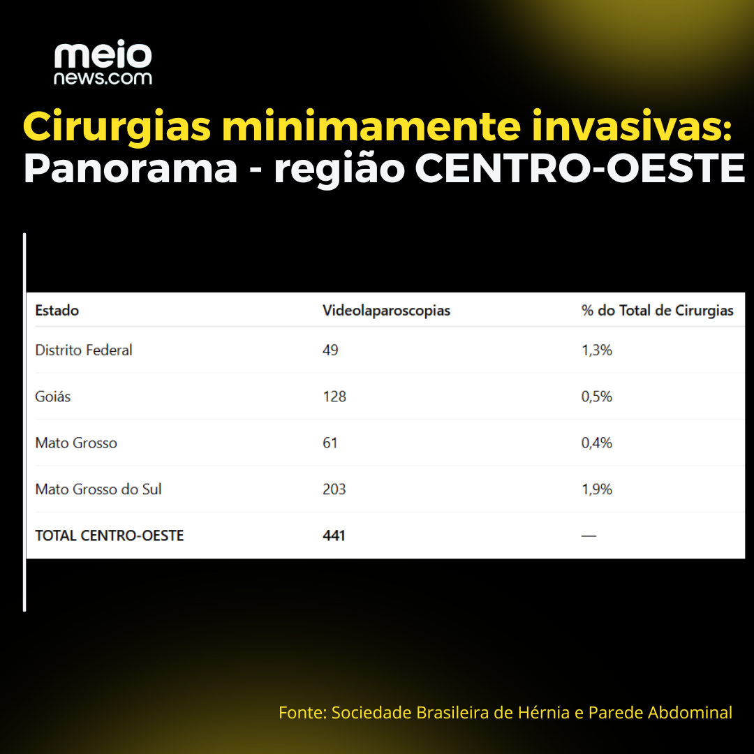 Os números correspondem ao biênio 2023-2024, abrangendo os 26 Estados e o Distrito Federal. Assim, com base na tabela verifica-se que proporcionalmente o Mato Grosso do Sul (no Centro-Oeste) foi o que mais realizou cirurgias com pequenas incisões - 1,9%. Em números gerais, no entanto, São Paulo foi o ente com mais registros, com 1.350 cirurgias videolaparascópicas.