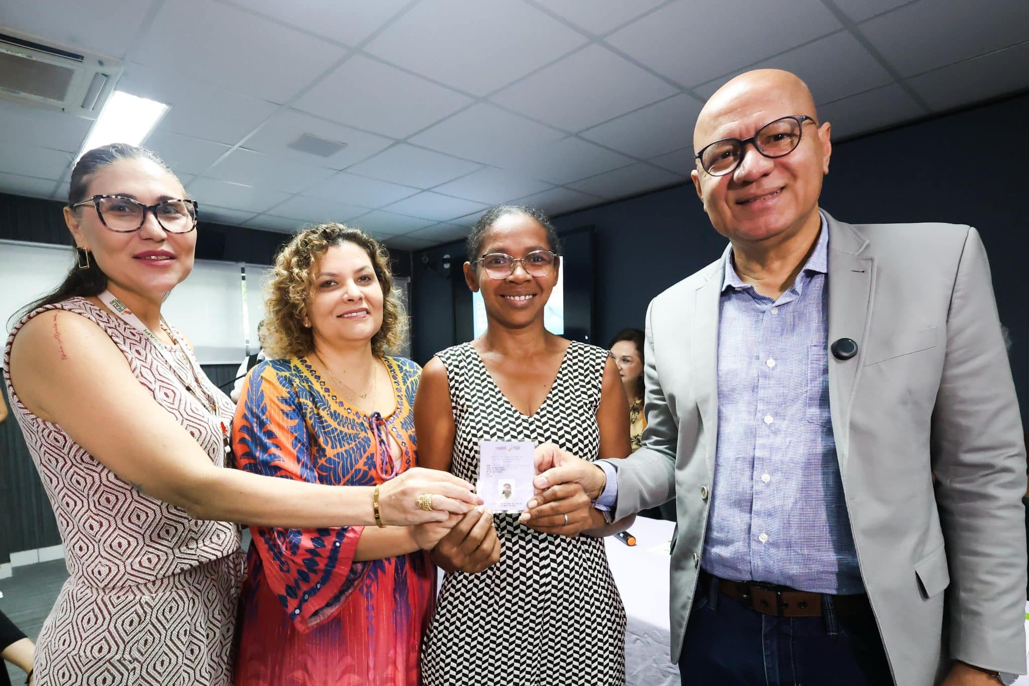#PARATODOSVEREM Na imagem, quatro pessoas estão em um ambiente interno bem iluminado, com teto de forro branco e paredes em tom escuro. À esquerda, uma mulher de cabelos presos, óculos grandes e vestido claro com estampa geométrica sorri levemente. Ao seu lado, uma segunda mulher, de cabelos cacheados e loiros, usa um vestido colorido em tons de laranja, azul e roxo. No centro, uma mulher de pele negra, cabelo preso e óculos segura um documento de identificação — a carteirinha do fibromiálgico — enquanto sorri para a câmera. À direita, Franzé Silva, um homem calvo, de óculos e pele clara, veste blazer cinza sobre camisa azul clara e também sorri. As quatro pessoas estão próximas, tocando o documento que a mulher ao centro segura, transmitindo um clima de celebração e reconhecimento. FIM DA DESCRIÇÃO.