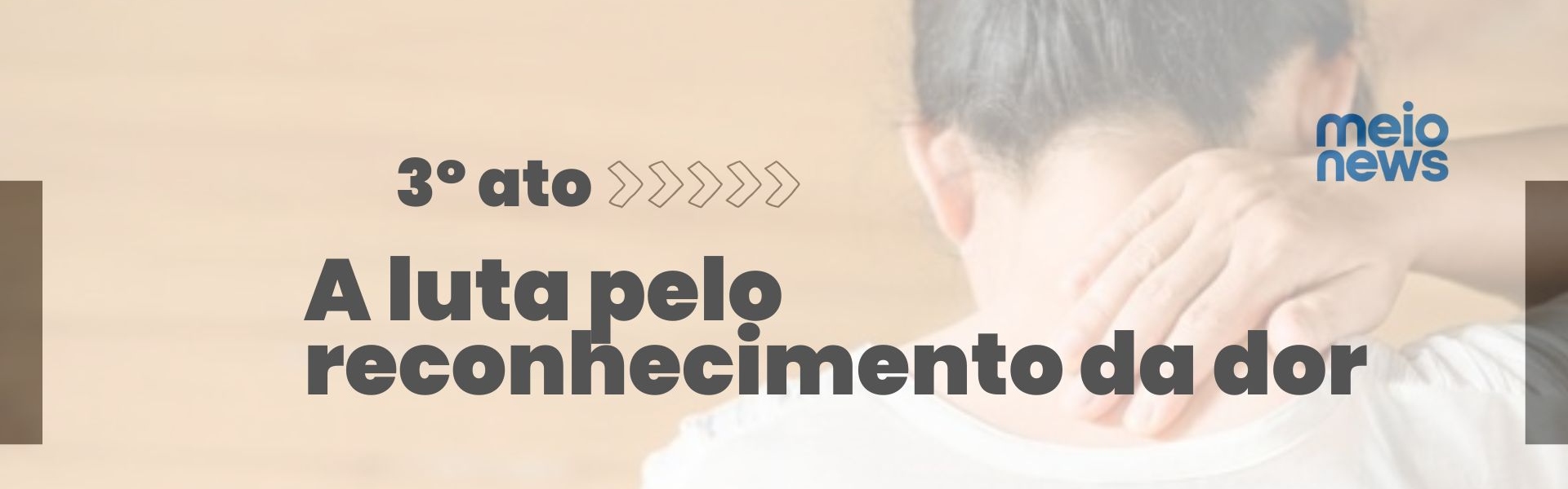 #PARATODOSVEREM  A imagem apresenta um banner informativo com fundo em tom bege claro. À direita, vê-se a parte superior do corpo de uma mulher de cabelos presos, vestindo uma blusa branca, que leva a mão à nuca, em um gesto que transmite dor ou desconforto físico. Em primeiro plano, sobre a imagem desfocada, está o texto principal em letras grandes e escuras: “3º ato >>>>> A luta pelo reconhecimento da dor.” No canto superior direito, aparece o logotipo do portal “meio news”, em letras minúsculas e na cor azul. FIM DA DESCRIÇÃO.