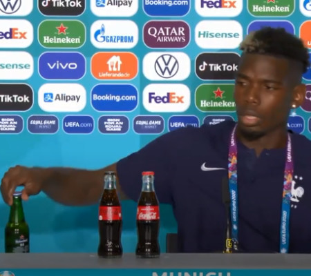 Depois que Cristiano Ronaldo escondeu as garrafas de Coca-Cola em coletiva de imprensa na Eurocopa e incentivar o consumo de água, Pogba, meio-campista francês, fez algo parecido em outra coletiva: escondeu uma garrafa de cerveja da Heineken.