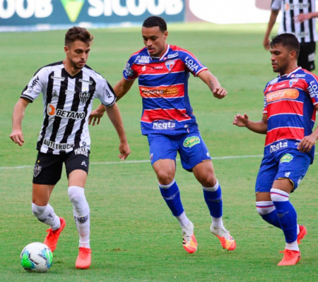 O Atlético-MG começou ditando o ritmo do confronto. O primeiro grande lance de perigo veio com Arana, mas Felipe Alves defendeu. Ronald respondeu, mas a bola foi no meio do gol, e Everson fez a defesa. Movimentado, o duelo ainda teve a tentativa de Hyoran, que passou muito perto da trave direita do Leão. David arriscou de muito longe e mandou por cima da meta de Everson. Sasha teve uma chance preciosa nos minutos finais, mas Felipe Alves fez um milagre. O Fortaleza se fechou e levou o jogo ao intervalo com placar de 0 a 0.