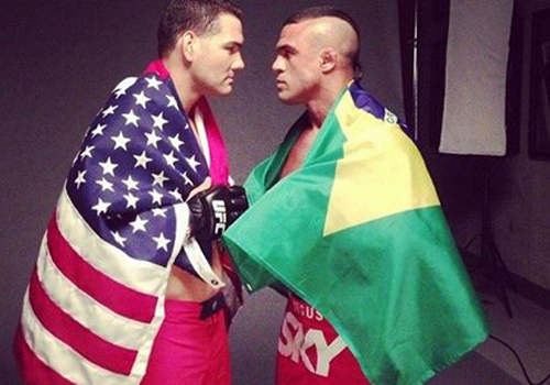 Vitor Belfort usou sua página no Facebook para divulgar o confronto com Chris Weidman, embate que valerá o cinturão dos peso médio no UFC 173, em Las Vegas. Coberto por uma bandeira do Brasil e de frente para o rival americano, pediu para o público ?lotar a arena de verde e amarelo? em 24 de maio, data da luta.