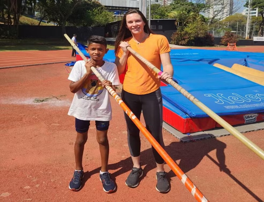 "Vocês sabem quem eu encontrei hoje? O Moisés, aquele menino do salto com vara que viralizou saltando na areia lá no Piauí. Ele veio até São Paulo, e eu estive na pista de atletismo para dar umas dicas a ele", disse Fabiana Murer em sua publicação.