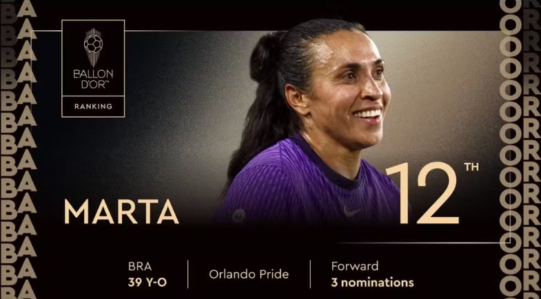 A atacante de 39 anos retornou à lista após seis temporadas fora. O desempenho na temporada 2024/25 recolocou Marta entre as melhores do mundo: ela foi vice-artilheira da liga dos Estados Unidos (NWSL) e ajudou o Orlando Pride a conquistar o título inédito da competição. Pela seleção brasileira, foi protagonista da campanha vitoriosa na Copa América, sendo eleita a melhor jogadora do torneio e decisiva na final contra a Colômbia.