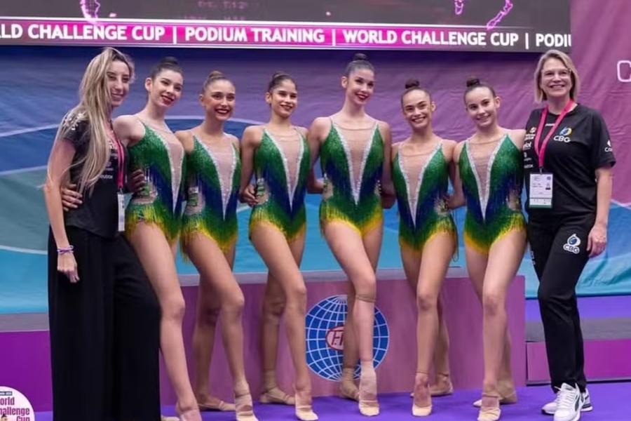 O Brasil conquistou neste sábado (10) sua primeira medalha de ouro no conjunto geral da Copa do Mundo de Ginástica Rítmica, em Portimão. As ginastas somaram 51.350 pontos, com destaque para a apresentação ao som de "Evidências", que rendeu 26.150 pontos na série mista. Na sexta-feira, o grupo já havia obtido 25.200 pontos na série com arco e bola.