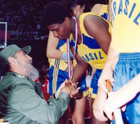 A ex-pivô Rutão conquistou o ouro com a seleção brasileira nos Jogos Pan-Americanos de Havana (Cuba), em 1991. Na foto ela aparece cumprimentando o então presidente Fidel Castro - CBB - Confederação Brasileira de Basketball