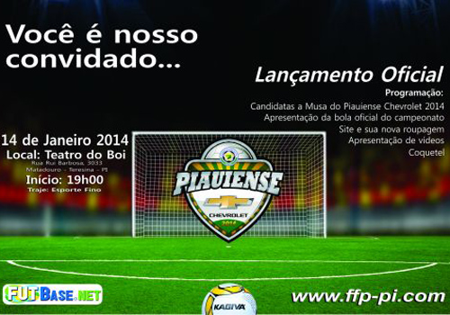 Acontece na noite desta terça-feira (14), a partir das 19h, o lançamento do Campeonato Piauiense 2014, pela Federação de Futebol do Piauí (FFP-PI), no Teatro do Boi, bairro Matadouro, zona Norte de Teresina.