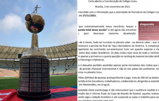 Uma carta aberta de um pai de um aluno à direção do colégio onde o filho de seis anos estuda tem viralizado nas redes sociais e provocado polêmica. Anderson Martins, autor do documento, reclama da decisão do Colégio Liceu, de Brasília, de marcar para 27 de novembro a formatura da turma da qual seu filho faz parte. A data coincide com a final da Taça Libertadores da América, que será disputada entre Flamengo e Palmeiras.