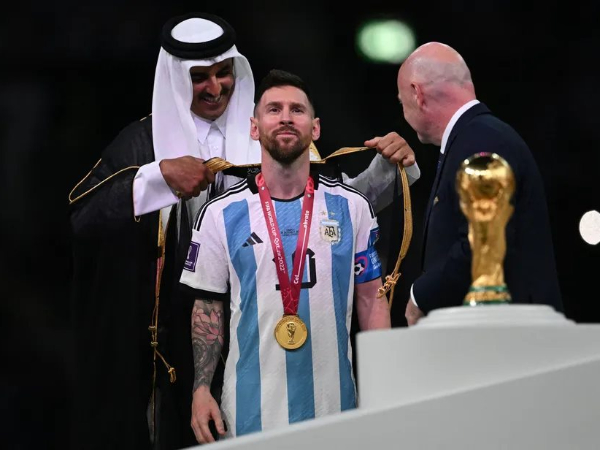 Lionel Messi, capitão da seleção Argentina, levantou a Copa do Mundo, o trófeu mais cobiçado do planeta, com o bisht, um manto elegante, de sede preta com detalhes em dourado, usado por líderes governamentais e religiosos, em cima do uniforme azul e branco. Esta é uma vestimenta de cerimônia, para ocasiões especiais. As informações são do O Globo.