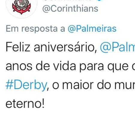 Em mensagem no Twitter, o Corinthians desejou muitos anos de vida ao adversário e tratou o clássico entre os clubes como o maior do mundo.