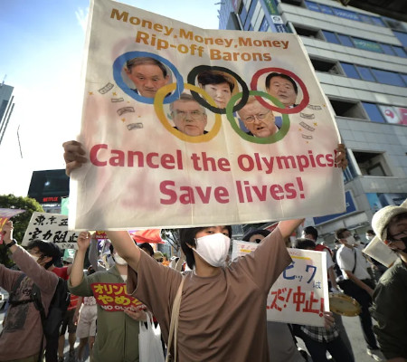 Além disso, os manifestantes criticaram os gastos exorbitantes para tornar Tóquio sede dos Jogos.