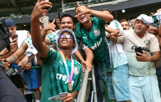 Endrick festeja o título da Copinha ao lado de torcedores, no Allianz Parque (Foto: Fabio Menotti/Palmeiras)