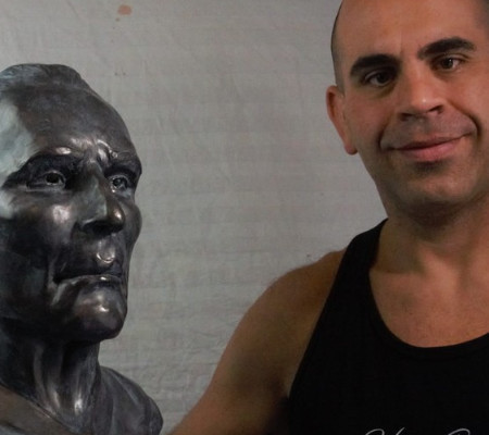 O trabalho de Rodrigo Artilheiro impressiona para quem está há pouco tempo no ramo. E, embora suas referências sejam artistas plásticos renomados, suas inspirações seguem no esporte. É por isso que decidiu aliar as duas profissões e prestar uma homenagem a Helio Gracie. Foram três meses, do desenho ao produto final, para esculpir um busto de cobre do expoente do jiu-jítsu. O carioca doou a peça - de cerca de 15kg, com base em mármore - na última semana para a academia dos irmãos Valente, em Miami, onde há uma espécie de museu da modalidade.