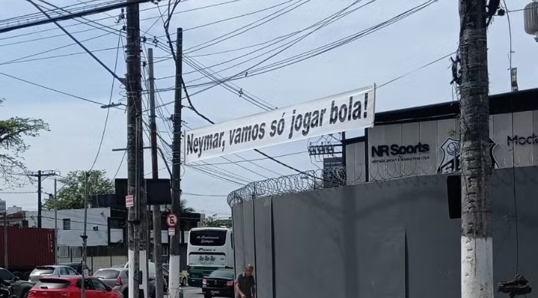 Uma faixa com críticas a Neymar foi colocada nesta quinta-feira (13) em frente ao CT Rei Pelé, onde treina a equipe profissional do Santos. A mensagem dizia: “Neymar, vamos só jogar bola!”, em tom de cobrança ao camisa 10.
