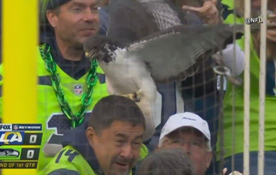 O animal é o mascote oficial do time Seattle Seahawks e "errou" na hora de voar em direção ao seu treinador, parando no meio da torcida.