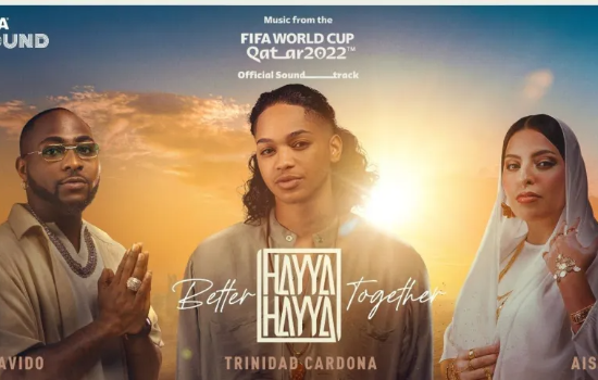 A Fifa divulgou nesta sexta-feira a primeira música oficial da Copa do Mundo do Catar, que acontece neste ano. O som, que recebe o nome de Hayya Hayya (Better Togheter), possui influências do R&B e do reggae e conta com a participação do norte-americano Trinidad Cardona, do ícone do Afrobeats, Davido, e da sensação do Catar, Aisha.