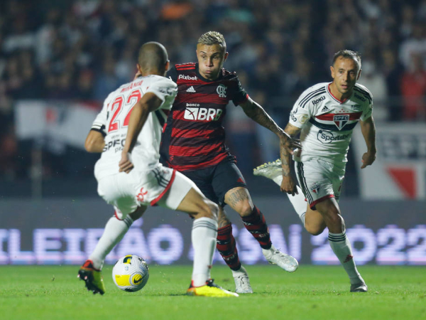 Ciente da superioridade do São Paulo, Dorival Jr também fez mudanças: Gabigol, João Gomes e Thiago Maia entraram nas vagas de Vidal, Diego e Marinho, respectivamente. E não demorou para o time rubro-negro equilibrar a partida. Aos 23 minutos, Matheusinho foi acionado por Gabigol e cruzou rasteiro para o meio da área, onde João Gomes chegou batendo de primeira, mas mandou por cima do gol, perdendo grande chance.