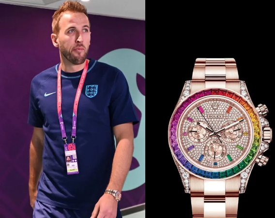 A descoberta foi divulgada nesta semana por um perfil no Instagram que destaca artigos de luxo utilizados por personalidades do esporte. O perfil Insane Luxury publicou que Harry Kane utilizava um Rolex Daytona "Rainbow" 116595RBOW com 18 quilates de ouro rosa, por isso o preço exorbitante.