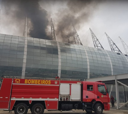 Um incêndio atinge a área interna da Arena Castelão, em Fortaleza, na manhã deste sábado (30). O fogo começou em uma cabine de rádio. Guarnições do Corpo de Bombeiros trabalham no local para controlar as chamas. Imagens mostram chamas altas e uma forte fumaça preta no local. Ainda não há confirmação sobre as causas do incêndio e se houve algum ferido, mas duas pessoas que inalaram fumaça receberam atendimento do Serviço de Atendimento Móvel de Urgência (Samu) no local.