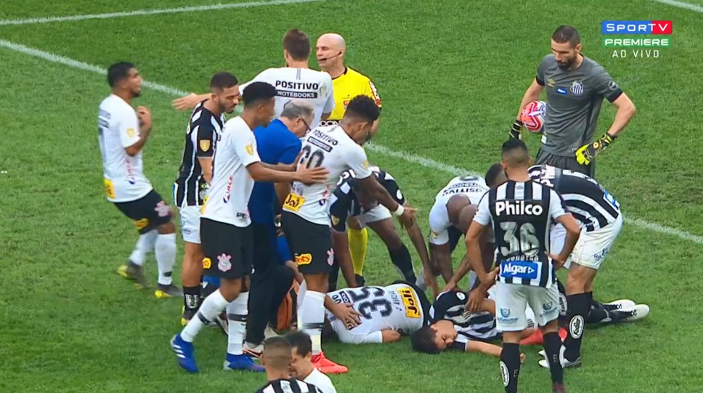 Felipe Aguilar, zagueiro do Santos, foi retirado do gramado da Arena em Itaquera de ambulância na tarde deste domingo durante o clássico contra o Corinthians. Houve aplausos da torcida corintiana para o resgate.