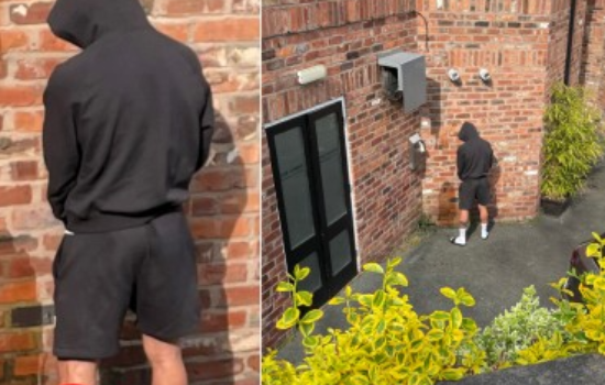 Uma forma de garantir que não estava sendo visto. Só que ele esqueceu de olhar também para trás, antes de começar a urinar.Ainda colocou o capuz para não ser identificado, mas acabou sendo reconhecido pela tatuagem na perna esquerda.