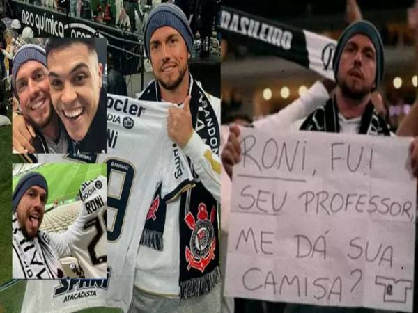 Uma das cenas marcantes na transmissão da partida entre Corinthians e Fluminense, foi sem dúvidas o cartaz levantado por um professor das arquibancadas da Neo Química Arena, pedindo a camisa de um dos seus ex-alunos, o volante alvinegro Roni.
