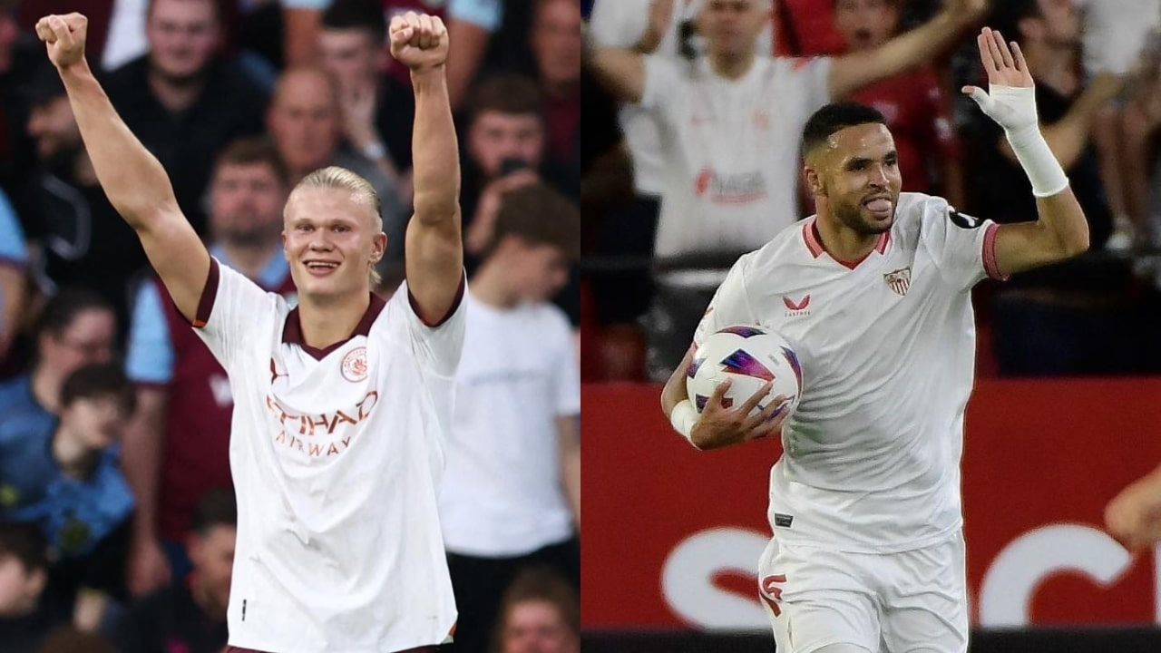 Erling Haaland, atacante norueguês do Manchester City, e Youssef En-Nesyri, atacante marroquino do Sevilla. | foto: DARREN STAPLES/AFP e CRISTINA QUICLER / AFP