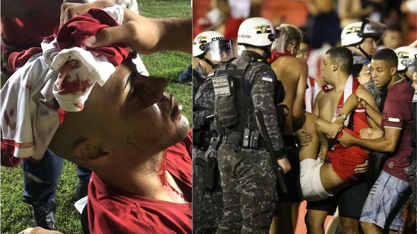 TENSÃO - Como resultado do confronto, vários torcedores ficaram feridos e precisaram de atendimento no gramado, alguns apresentando ferimentos com sangramento. Segundo a Polícia Militar, a confusão começou quando alguns torcedores do Náutico suspeitaram que um homem vestido à paisana e usando uma camisa azul estivesse torcendo pelo Sport, uma informação posteriormente negada por amigos e familiares.