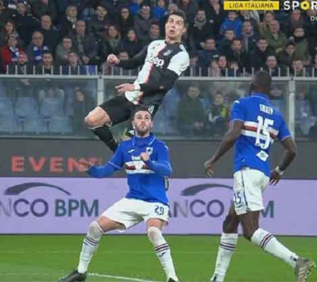 O português mais respeitado no futebol, Cristiano Ronaldo deu mais uma prova de que é um jogador de outro mundo. Em uma jogada nesta quarta-feira (18), o português desafio até mesmo as leis físicas. A partida da Juventus contra a Sampdoria valia pelo campeonato italiano. No gol da vitória, Cristiano toma impulsão, sobre 2.56 metros para cabecear uma bola e colocá-la no fundo da rede.