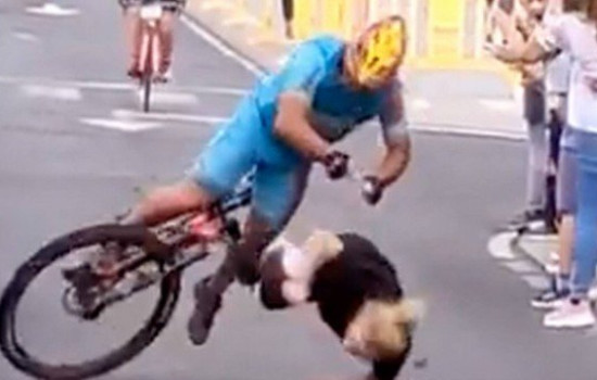 Mulher caiu logo após ser atripelada por ciclista na prova - reprodução