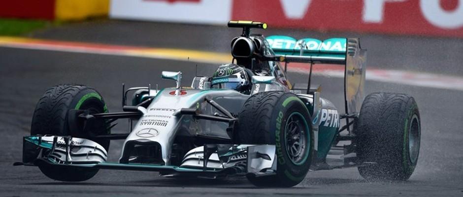 Nico Rosberg, da Mercedes, com pneus intermediários no treino classificatório para o GP da Bélgica | Foto: Getty Images