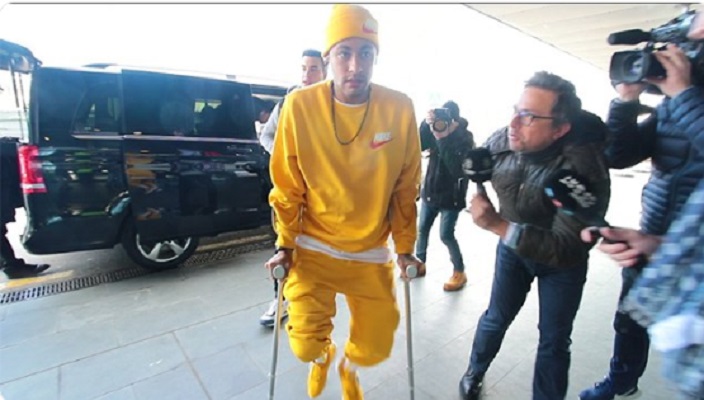No vídeo, gravado no aeroporto de Barcelona, Neymar aparece caminhando de muletas por conta da fratura no pé direito que o afastará dos gramados por cerca de 10 semanas. Segundo o PSG, o atacante brasileiro esteve na cidade como "início do protocolo médico estabelecido" para a sua recuperação. Ele retorna ainda nesta quinta-feira para Paris.