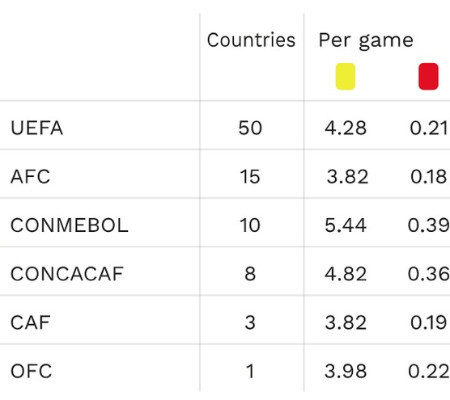 A confederação com os índices mais altos de cartões foi a sul-americana, com média de quase 6 por partida. A liga com as maiores médias foi a boliviana, com quase 7 por partida (seia amarelos e um vermelho). Da Conmebol foram considerados os campeonatos de primeira divisão da Argentina, Bolívia, Brasil, Chile, Colômbia, Equador, Paraguai, Peru, Uruguai e Venezuela.