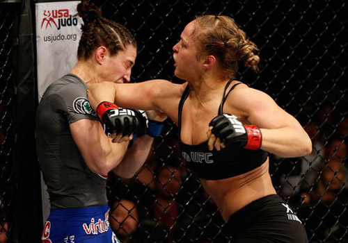 A polêmica parece rondar a campeã feminina dos pesos-galos do UFC Ronda Rousey. Na madrugada deste domingo, a lutadora venceu pela nona vez na carreira, e defendeu seu cinturão pela terceira vez diante de Sara McMann, uma medalhista olímpica de wrestling que jamais havia sido derrotada em sete combates. Tudo certo para ela, a não ser pela forma como a vitória foi conseguida. Com apenas 1m06s de luta, a campeã aplicou uma joelhada na linha de cintura da desafiante, que caiu. O árbitro Herb Dean decidiu encerrar a luta no exato instante que McMann dava sinais de recuperação, o que provocou a ira do público presente ao Mandalay Bay, em Las Vegas, lembrando a mesma vaia ouvida pela campeã quando não apertou a mão de MIesha Tate após derrotá-la em sua última luta.